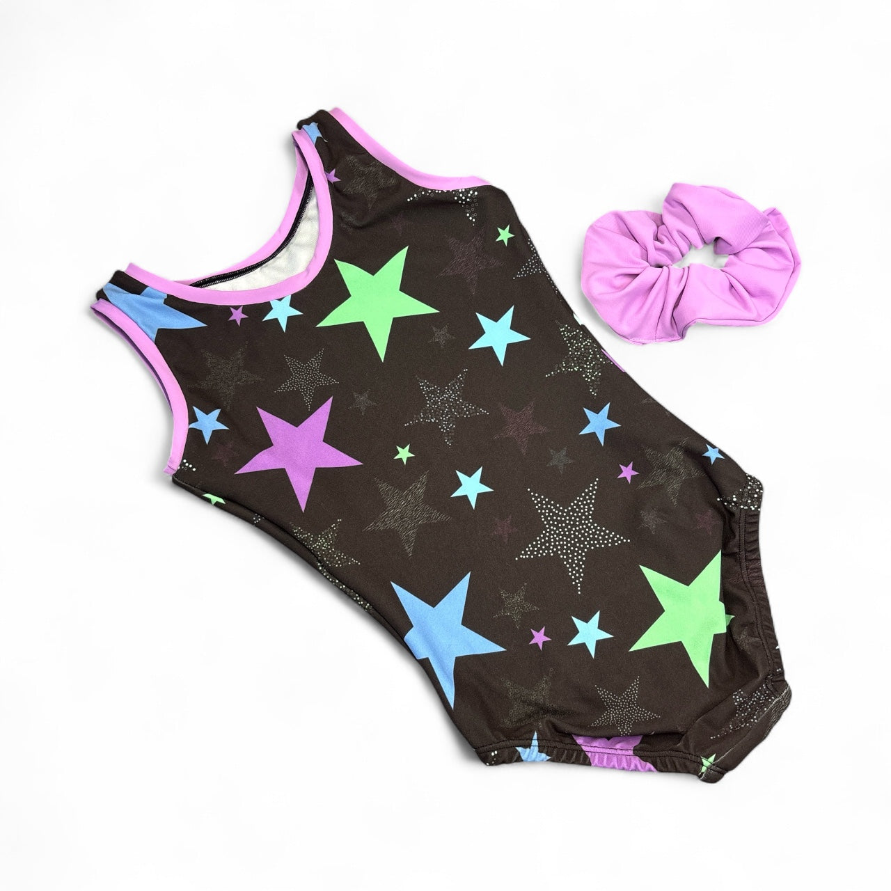 Sublimated Sleeveless leotard with contrast bands, tank and open back design. All our leotards come with a best matching scrunchie. Default Fabric Type: Regular Spandex.