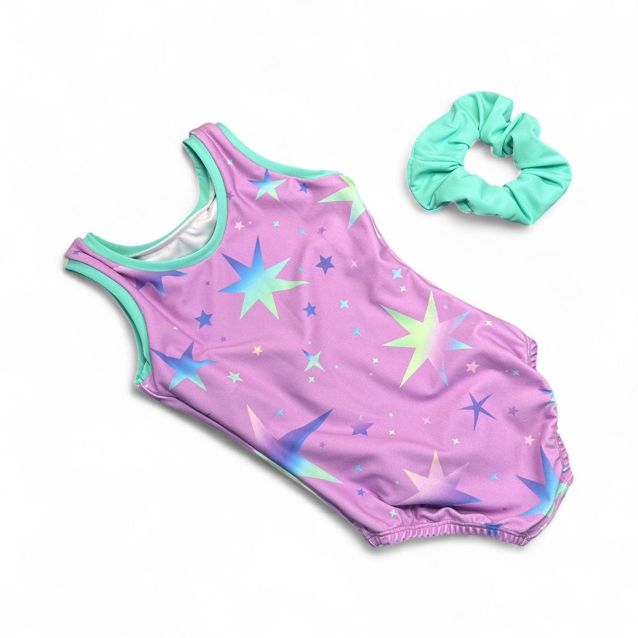 Sublimated Sleeveless leotard with contrast bands, tank and open back design. All our leotards come with a best matching scrunchie. Default Fabric Type: Regular Spandex.
