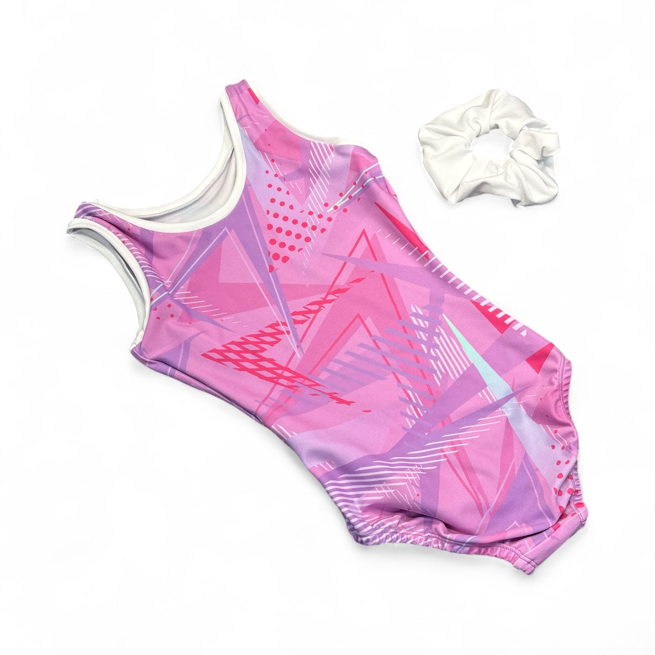 Sublimated Sleeveless leotard with contrast bands, tank and open back design. All our leotards come with a best matching scrunchie. Default Fabric Type: Regular Spandex.