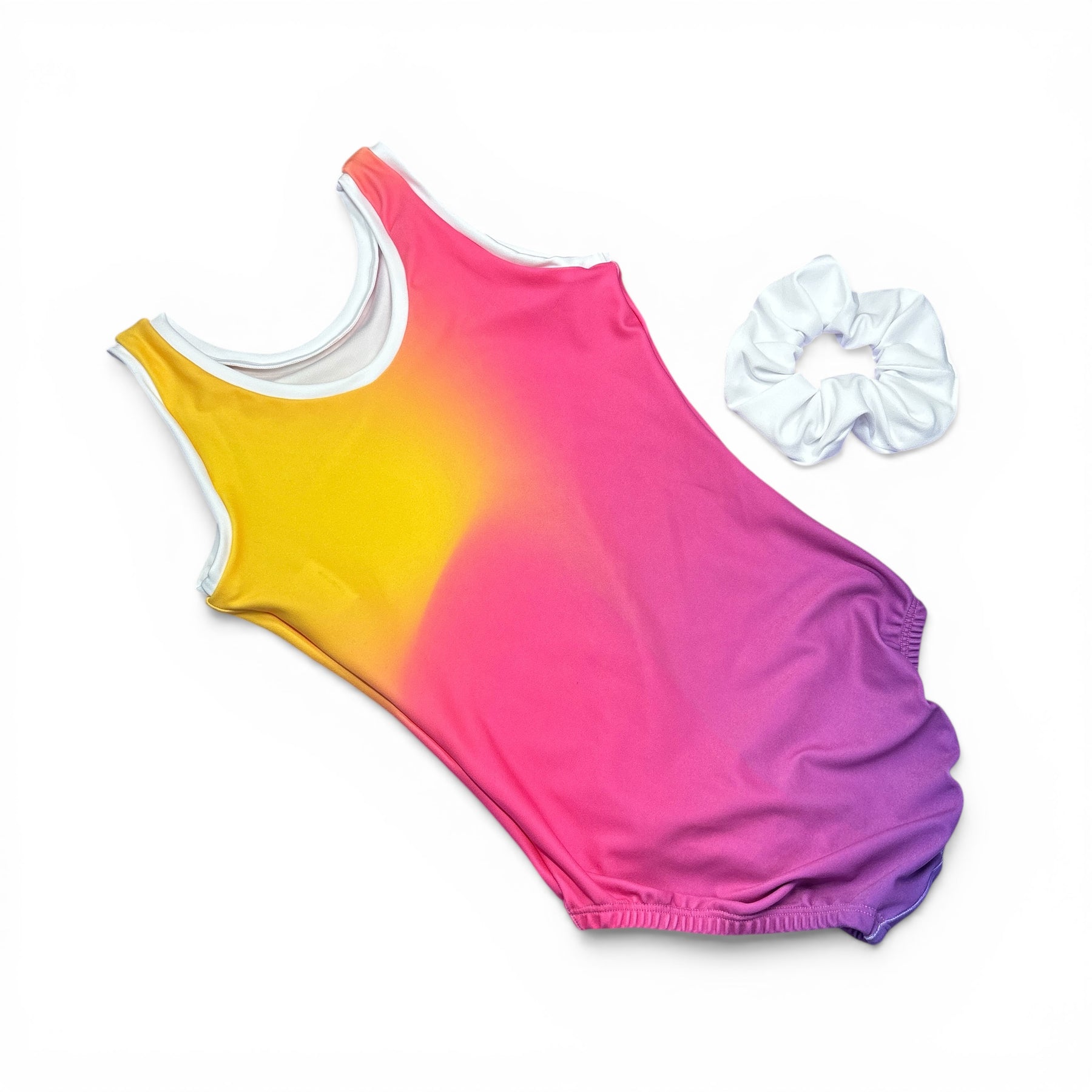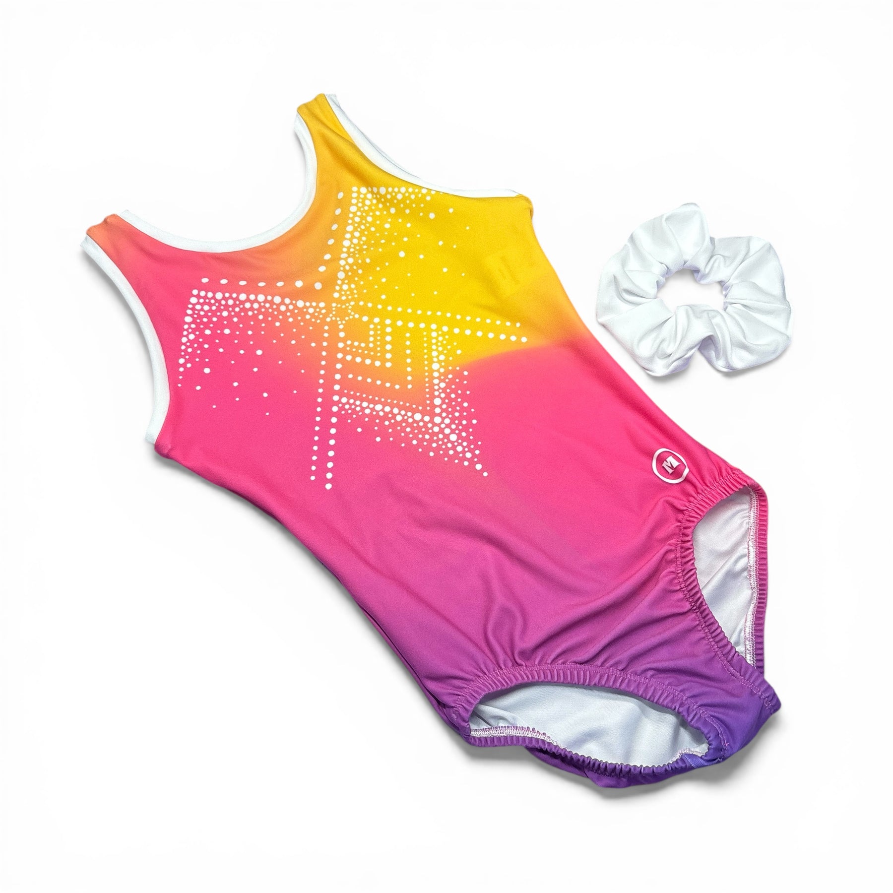 Sublimated Sleeveless leotard with contrast bands, tank and open back design. All our leotards come with a best matching scrunchie. Default Fabric Type: Regular Spandex.