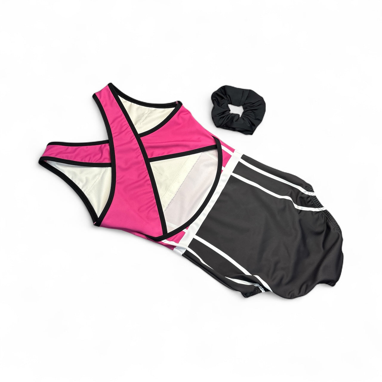 Sublimated Sleeveless leotard with contrast bands, tank and open back design. All our leotards come with a best matching scrunchie. Default Fabric Type: Regular Spandex.