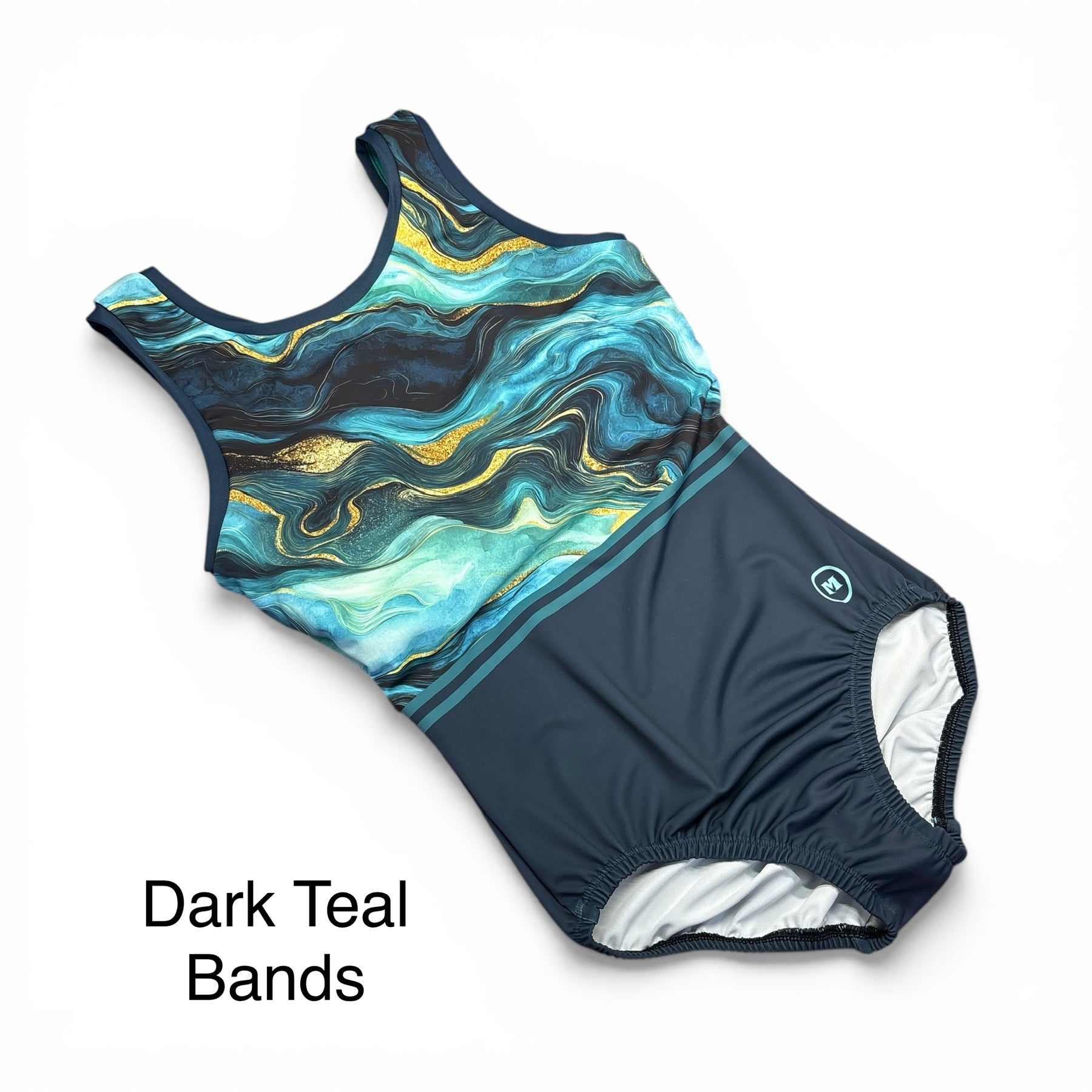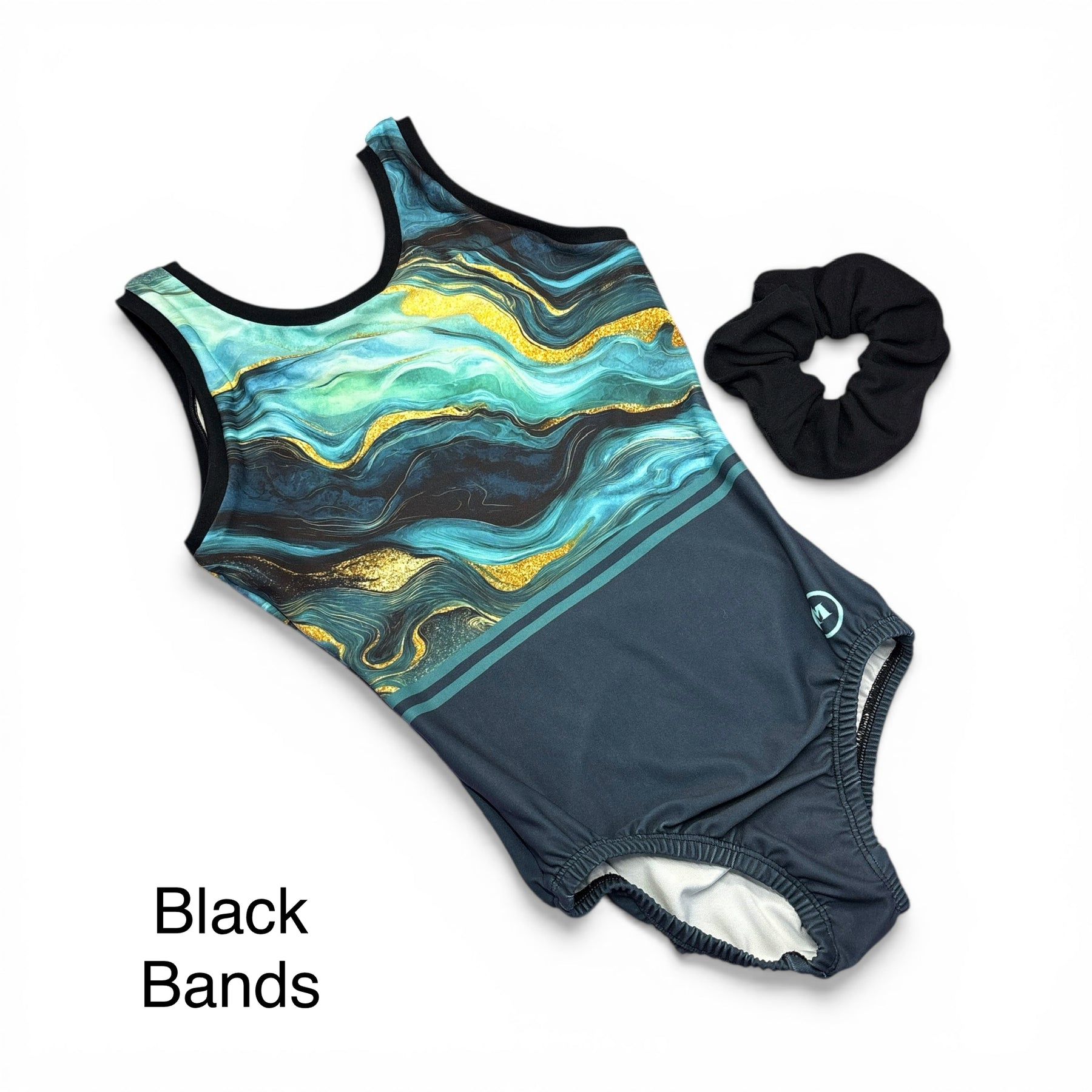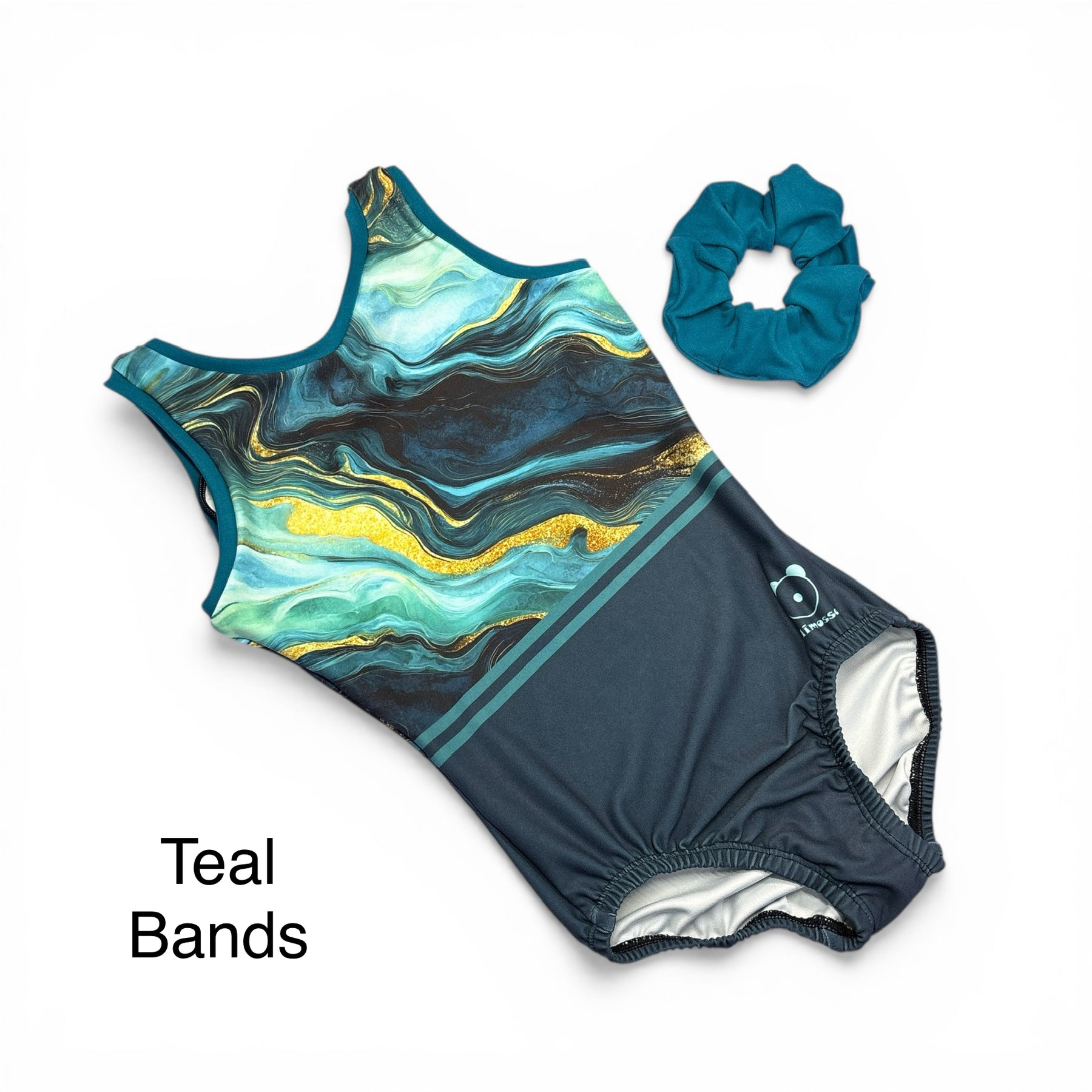 Sublimated Sleeveless leotard with contrast bands. All our leotards come with a best matching scrunchie.